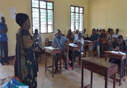 Afisa elimu Halmashauri ya wilaya ya masasi  Elizabeth Mlaponi akiongea na walimu wa shule za Msingi Tarafa ya Lulindi kwene mafunzo ya kujengeana uwezo kwenye masomo ya Sayansi, Hesabu na ki...